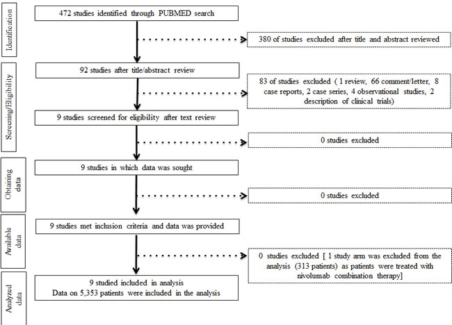Initially our strategy yielded 472 publications through PubMed search. After screening of the study titles and abstracts 380 studies were excluded, as those were not prospective randomized trials. After text review 83 more studies were excluded for not meeting the inclusion criteria (Figure 1). Nine studies met the inclusion criteria and data were extracted. These studies comprised eight phase III and one phase II randomized trials. Six studies investigated nivolumab and three pembrolizumab. Five studies enrolled patients with metastastic melanoma, three NSCLC, and one RCC (Table 1).