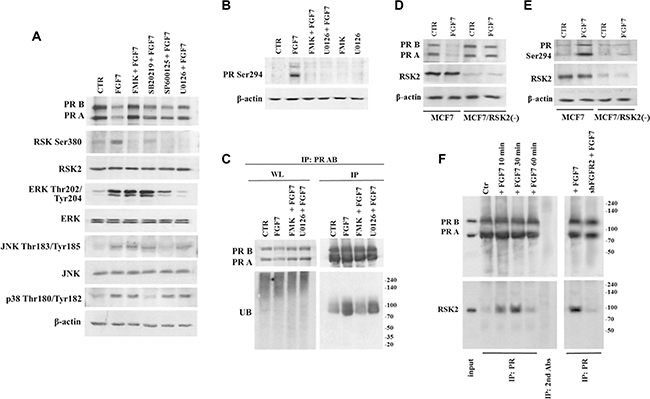 Figure 4: RSK2 mediates FGF7/FGFR2-dependent degradation of PR. (A) Involvement of various members of MAPK signalling pathway in FGF7/FGFR2-dependent PR degradation. Cells were pre-treated with following inhibitors FMK (10 μM), U0126 (10 μM), SB202190 (10 μM) or SP600125 (10 μM) and stimulated with FGF7 (50 ng/ml) for 24 h. (B) RSKs activity is responsible for PR Ser294 phosphorylation (upon 60 min of exposure to FGF7) and (C) PR ubiquitination (upon 3 h of exposure to FGF7). Protein amount in both lysate (WL) and immunoprecipitated fraction was normalized. (D) Knock-down of RSK2 abrogates PR degradation and (E) phosphorylation. (F) FGF7/FGR2 signalling results in formation of transient PR/RSK2 complex.