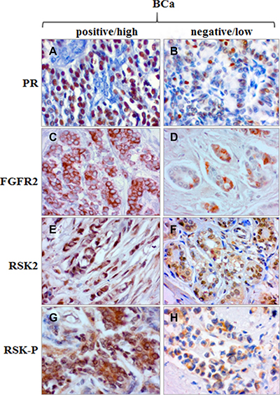 Figure 6: Expression of PR, FGFR2, RSK2 and RSK-P in BCa tissue samples. Examples of high/positive and low/negative immunoreactivity for PR (A/B), FGFR2 (C/D), RSK2 (E/F) and RSK-P (G/H).