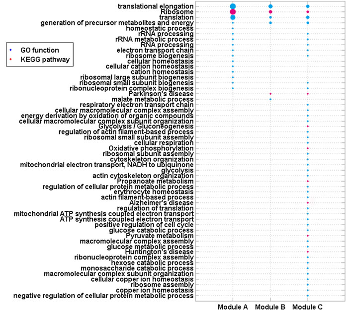 BP_Fat of GO and pathways of KEGG enriched for these 3 modules using DAVID were selected as stated in Materials and Methods (P-Value<0.05, Figure 3). All three modules were enriched in functions of “translation elongation”, “translation” and “generation of precursor metabolites and energy”, and the pathway of “Ribosome”. These enriched functions and pathways have been verified to be associated with ICM and diseases caused it (DCM and CHD).