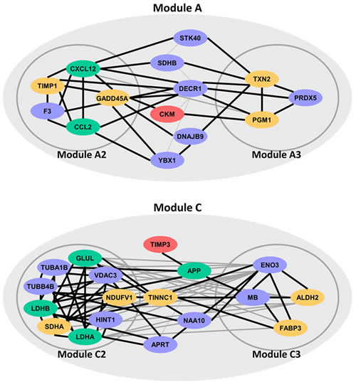 For genes in Module A2, the research of Bironaite et al. showed that TIMP1 significantly increased in sera in DCM myocardium [27]. Results from DNA methylation profile between DCM patients and normal individuals showed that selenium deficiency increased the expression of the Gadd45α, i.e. gene GADD45A [28]. CCL2 was CHD disease gene in OMIM [26]. Huang et al. and Franceschini et al. observed significant association between SNPs of CXCL12, rs1746048-C and rs501120, and an increased risk of CHD in Han Chinese and US cohorts, respectively [29, 30]. Many studies have shown that DCM was one of main clinical manifestations of PGM1 (in Module A3) deficiency [31, 32]. Western blot and histological analysis revealed that TXN2 (Module A3) protein expression levels were reduced in hearts from patients with DCM. Cardiac-specific TXN2 knockout mice developed DCM at 1 month of age with increased heart size, reduced ventricular wall thickness, and a progressive decline in left ventricular contractile function [33]. CKM in Module A that interacted with Module A2 and A3 was reported to be associated with ICM since protein levels of CKM were found to be reduced in ICM patients [34].