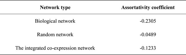 The assortativity of a biological network, a random network and the integrated co-expression network were measured by their assortativity coefficients (see Materials and Methods). It was showed that the biological network was disassortative (assortativity coefficient <0) as high degree nodes were more likely to connect to low degree nodes. For the random network, the assortativity coefficient was close to 0. These results were consistent with previous studies [6]. Our integrated co-expression network was disassortative since the assortativity coefficient<0 (Table 1). These results indicated that our integrated co-expression network had similar topology features as biological networks.