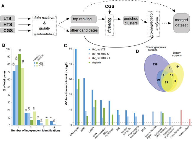 Figure 1: Identification of yeast genes mediating response to UV, X-ray radiation, or cisplatin. A. Workflow for identification of yeast genes modulating sensitivity to UV, ionizing radiation, and cisplatin treatment. LTS, low throughput screen; HTS, high throughput screen; CGS, chemogenomic screen. B. Classification of candidate genes based on the number of independent studies that identified each gene as contributory to resistance to UV or radiation (UV_rad) or to cisplatin, as well as by type of supporting study (LTS and HTS). Y-axis indicates percent of genes for each class, while the absolute number of supporting studies is shown on the top of each bar. C. Enrichment in GO terms for specific subsets of candidate genes. NER, nucleotide excision repair; DSBR, double strand break repair; HR, homologous recombination; BER, base excision repair. Dashed line indicates the threshold for the statistical significance. D. Overlap between cisplatin resistance gene sets identified in binary LTS/HTS (yellow) and chemogenomic (blue) screens: numbers represent individual genes. Darker colors indicate genes supported by ≥2 binary screens, or by 3 independent chemogenomic studies; lighter colors indicate genes supported by 1 binary screen, or by 2 of 3 chemogenomic studies.