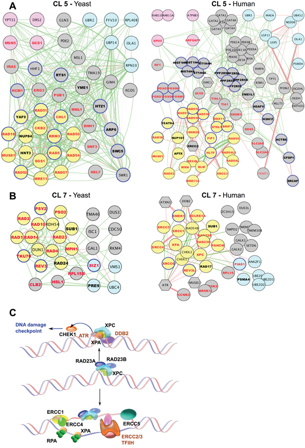 Figure 2: Examples of functional clusters of genes regulating response to UV, X-ray radiation, or cisplatin. A. Graphical representation of composition and selected properties of clusters (CL) enriched in UV_rad sensitivity-modulating genes (CL 3), in cisplatin sensitivity-modulating genes (CL 10 and 11), or in both (CL 7). Key indicates genes identified as UV_rad HTS≥2 and/or UV_rad LTS (UV_rad-H); or as inducing cisplatin resistance from binary (cispl-B), or chemogenomics (cispl CG-H) with high statistical significance (see text for details). Genes initially defined as lower confidence because of identification from the UV_rad HTS=1 set alone, or only by a single high score for cisplatin sensitization from a single chemogenomics screen, but significantly enriched (p<0.05) within clusters, are denoted as “UV_rad-L” and “cispl-CG-L”, respectively. “Yeast DDR” indicates genes annotated as involved in response to DNA damage; “UV_rad-hom” indicates functional orthologs in fly and/or worm; “HS_hom”, genes have unambiguous orthologs in H. sapiens. See Supplementary Table 3 for detailed information on all identified clusters. B. Enrichment in Gene Ontology (GO) functions for the identified clusters. C. Overall evolutionary conservation of S. cerevisiae cisplatin resistance genes in H. sapiens. Numbers shown in red font represent individual yeast genes, while green font is used for the number of human genes orthologous to the yeast counterpart. The fraction of yeast genes annotated as involved in DDR is shown in blue.