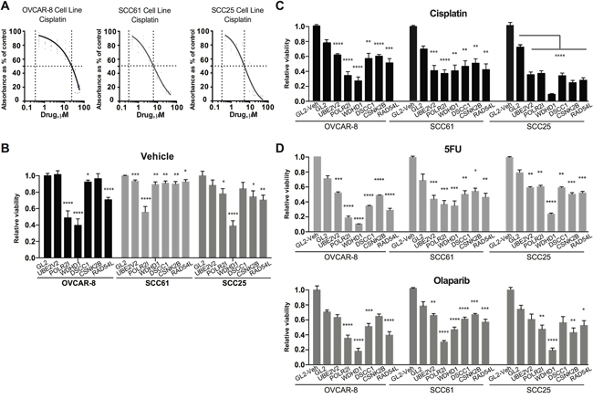 Human genes to be assessed for modulation of cisplatin sensitivity were depleted using siRNAs from Qiagen (Hilden, Germany) with positive and negative controls for transfection and normalization. After 24 hours recovery, cells were treated with cisplatin or vehicle for 72 hours, cell viability measured using a Cell Titer Blue assay (Promega, Madison, WI ), and sensitization index (SI) determined. For each gene of interest, siRNA sensitization assays were initially performed with 4 independent siRNAs; subsequently, the two best performing RNAs (Supplementary Table 8) were pooled and used for functional testing. For evaluation of depletion efficacy, at 48 hours after transfection, total RNA was extracted using the RNeasy Mini Kit (Qiagen, Hilden, Germany), reverse-transcribed using standard approaches and analyzed by Taqman chemistry using Assay-on-Demand (Supplementary Table 9). To explore specificity of genes for response to cisplatin, 24 hours post transfection with pooled siRNAs, cells were treated in parallel with selected concentrations of cisplatin, 5-fluorouracil (5-FU), paclitaxel, olaparib or vehicle. All drugs, except olaparib, were obtained in Fox Chase Cancer Center Pharmacy. Olaparib was purchased from LC Laboratories, Woburn, MA. After 72 hours, a CellTiterBlue assay was performed following the manufacturer’s protocol, and the SI was determined for each drug as previously described [18].