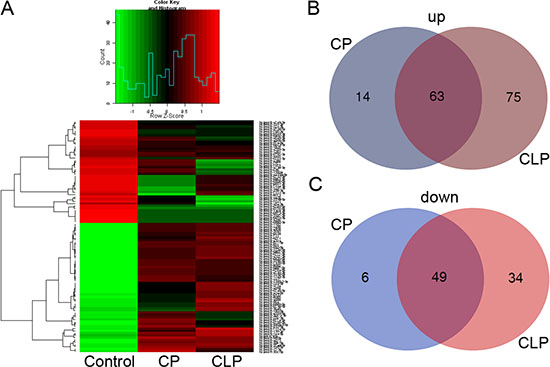 Nine samples, which included three NSCP plasma samples (mixed as the CP group), three NSCLP plasma samples (mixed as the CLP group) and three normal plasma samples (mixed as the Control group), were analysed using Agilent human miRNA microarray chips (8*60K) v21.0 (ShanghaiBio Corporation, Shanghai, China). The raw data were normalized using the quantile algorithm in GeneSpring Software 12.6 (Agilent Technologies, Santa Clara, CA, USA). The differentially expressed miRNAs that showed a two-fold or greater change were screened. Venn diagrams were draw online (http://bioinformatics.psb.ugent.be/webtools/Venn/).