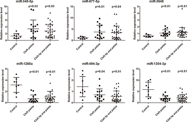 NSCP and NSCLP are developmental defects. The differentially expressed plasma miRNAs identified in the affected infants could be from their mother’s blood. Further elucidation of the sources of the plasma miRNAs in human tissues and their roles in the pathogenesis of cleft palate or cleft lip with cleft palate, particularly in palate development or the regulation of cranial neural crest (CNC) cells that give rise to craniofacial structures, needs to be further explored. In addition, larger samples are needed to perform receiver operating characteristic (ROC) curve analysis to prove that some of the children plasma microRNAs are promising biomarkers.