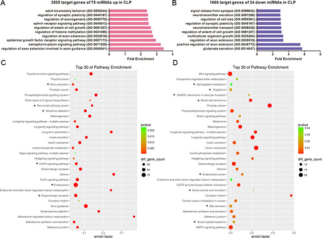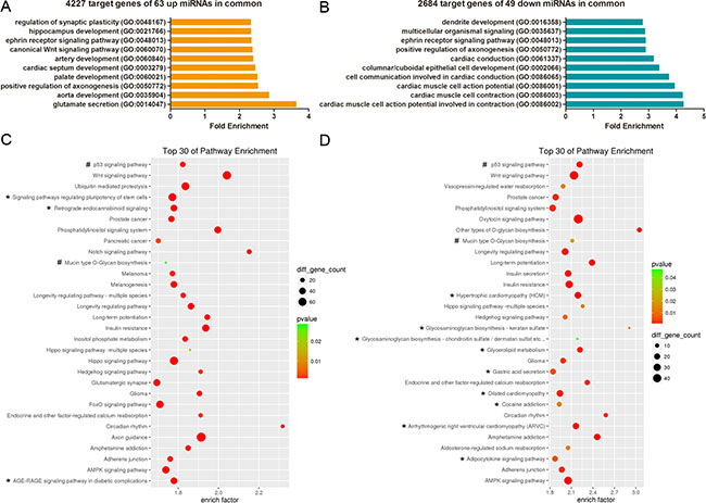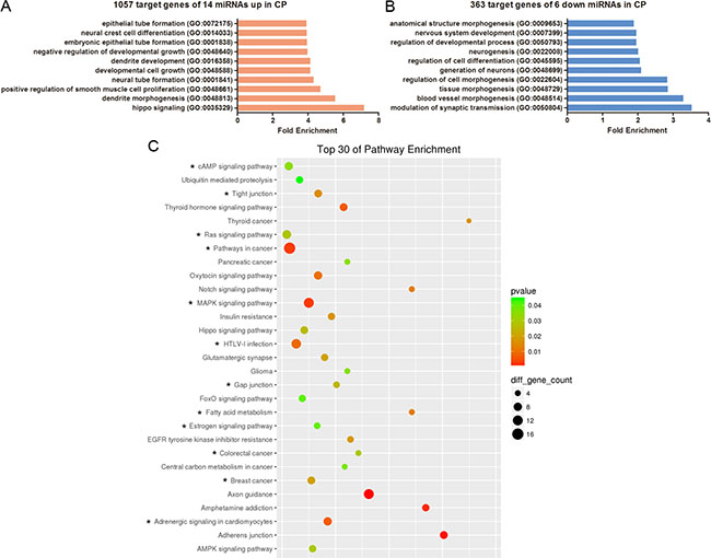 Recent studies suggest that isolated cleft palate only (CPO) has independent genetic causes and should be evaluated separately [25, 26]. Therefore, we analysed the predictive target genes of nonoverlapping miRNAs in CP and CLP using GO and KEGG pathway analysis. Interestingly, the top 10 enriched GO terms showed that Hippo signalling, dendrite morphogenesis, modulation of synaptic transmission and tissue morphogenesis were related to CP. Thirteen pathways of the top 30 enriched pathways were uniquely associated with CP including 2-oxocarboxylic acid metabolism, adrenergic signalling in cardiomyocytes, breast cancer, the cAMP signalling pathway, colorectal cancer, the oestrogen signalling pathway, fatty acid metabolism, gap junctions, HTLV-I infection, the MAPK signalling pathway, pathways in cancer, the ras signalling pathway, and tight junctions. In contrast, 14 pathways of the top 30 enriched pathways were only linked with CLP including dopaminergic synapses, endocytosis, the GnRH signalling pathway, morphine addiction, non-small cell lung cancer, renin secretion, acute myeloid leukaemia, bile secretion, dorso-ventral axis formation, endometrial cancer, renal cell carcinoma, shigellosis, SNARE interactions in vesicular transport, and Sphingolipid metabolism.