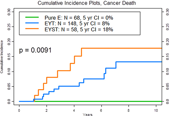 Results of this study showed that patients whose primary tumor comprised the three most common NSGCT histological phenotypes (45% of our 11-year patient population) [3], i.e., pure E, EYT, or EYST, experienced disparate cancer-specific mortality rates at 5 years (Figure 1, P =.001). Although it is commonly assumed that recurrent clinical stage I NSGCT is very curable with standard chemotherapy and surgery (hence our rationale for active surveillance in all patients), certain patients with a particular tumor phenotype (i.e., EYST) and recurrent disease (i.e., clinical stage IB) may harbor potentially chemoresistant or refractory disease that becomes deadly when it is neglected or delayed and warrants an intensive surveillance or proactive treatment strategy (e.g., adjuvant chemotherapy).