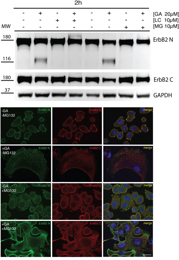 Some of our findings confirm previous studies, in particular here we show that GA promotes the generation of a p116-ERBB2 signaling impaired fragment in SKBR3 cells, which overexpress the endogenous ERBB2 due to ERBB2 gene amplification. Previous findings reported the generation of a 135kDa fragment upon GA treatment [29], this discrepancy in fragments mass is likely due to the use of an ERBB2/ERBB1 chimeric construct expressed in NIH3T3 mouse fibroblasts [29]. In addition, our finding of ERBB2 polyubiquitination and cleavage induced by GA treatment confirm previous studies [23, 29, 39].