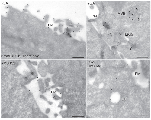 SKBR3 cells, cultured on 6-cm dishes, were washed in CO2-independent medium and incubated in CO2-independent medium containing 20μM GA, either alone or in the presence of proteasomal inhibitors 10μM MG132 and 10μM lactacystin for 2 hours at 37C. Cells were then prepared for cryo-immunoEM according to the Tokuyasu method. Briefly, cells were fixed in 2% paraformaldehyde - 0.2% glutaraldehyde in PBS for 2 hours at room temperature. Next, cells were gently scraped and embedded in 12% gelatin. After overnight Sucrose 2.3M infusion, small squared blocks were mounted on aluminium pins and frozen in liquid nitrogen. Ultrathin cryosections of 60nm were cut with Leica UltraCut UCT microtome (Leica Microsystems, Wetzlar, Germany) and immunolabeled with anti-ERBB2 antibody (9G6, Santa Cruz, St Louis, USA). Protein A-gold 15nm was used to reveal labeling of ERBB2.