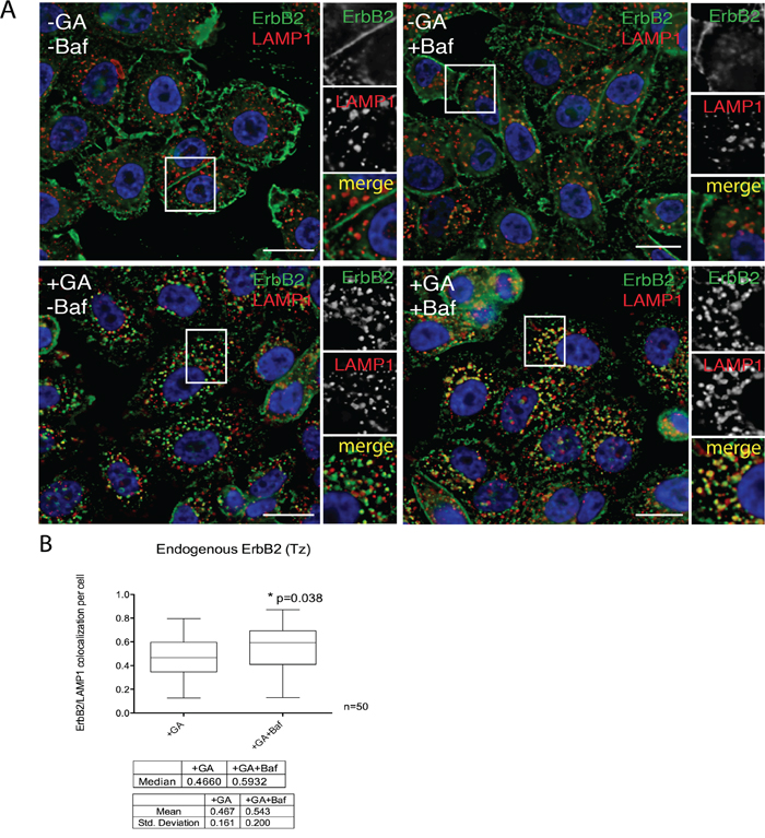 Our results indicate so far that, upon GA treatment, ERBB2 is cleaved in EE giving origin to a p116 protein, in a proteasome-dependent manner. We next asked whether the degradation of p116-ERBB2 occurs in the late endosome/lysosome, or in EE compartments. To answer this question, we localized ERBB2 by immunofluorescence in GA treated cells, in the presence or in the absence of the lysosomal inhibitor bafilomycin A1 (Baf), a specific inhibitor of the vacuolar H+ ATPase (V-ATPase). The co-localization between endogenous ERBB2 and LAMP-1 (Figure 6A) increased in the presence of Baf, compared to control cells (Figure 6B). These results support the conclusion that ERBB2 cleaved in EE is eventually rapidly degraded in lysosomes, so that it becomes promptly detectable only when their activity is inhibited.