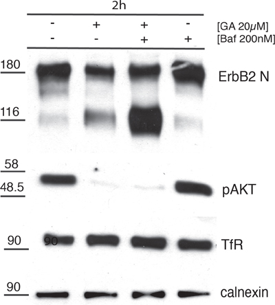 Figure 7: p116-ERBB2 isoform is signaling impaired and degraded in lysosomes. SKBR3 cells were untreated or treated with 20μM GA, 200nM BafilomycinA1 (Baf) alone or in combination for 2 hours at 37°C. The total p185-ERBB2, the GA-induced p116-ERBB2, p-AKT and TfR protein levels were assessed by Western blot using Abs recognizing the extracellular domain of ERBB2 (Ab-20), p-AKT and TfR. Calnexin was used as loading control. On the left side of the blot the migration of protein molecular mass standards expressed in kDa is shown.