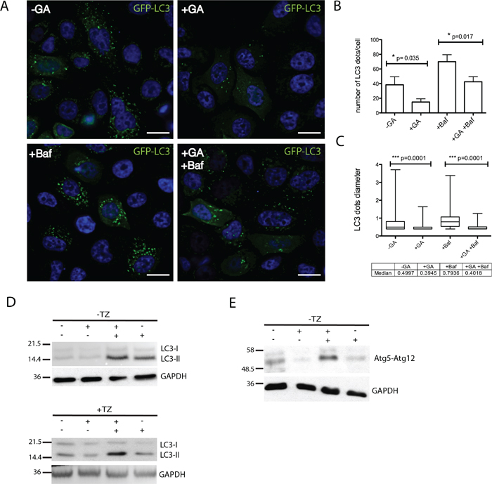 Figure 8: GA inhibits early autophagy. A. SKBR3 transiently transfected with GFP-LC3 for 18 hours and then treated with GA, BafilomycinA1 (Baf) and GA+Baf for 2 hours at 37°C (green signal, GFP-LC3; blue signal, DAPI). Representative images are shown from two independent experiments. Scale bars: 10μM. Note that in GA-treated cells few GFP-LC3 dots are visible if compared to untreated and Baf-treated cells. B. Quantification of the average number of LC3 dots in cells (n=50) shows that GA significantly decreases LC3-positive autophagosomes (p=0.035) compared to untreated cells. Accordingly, when Baf was added to inhibit autophagosome/lysosomal fusion, GA treatment decreases the number of LC3-positive autophagosomes (p=0.017). C. Quantification of the average size of LC3 dots in SKBR3 cells (n=3, 50 cells analyzed each experiment). GA significantly decreases LC3-positive autophagosomes size (p=0.001) either alone or in co-treatment with Baf. The bottom and the top of each box are the first and third quartile, while the line inside the box represents the median (second quartile). The ends of the wiskers represent the minimum and the maximum data value. D. Autophagic flux was assessed by western blot analysis in SKBR3 cells treated with GA, Baf and GA+Baf for 2 hours at 37°C in the absence or presence of TZ. Accordingly with data presented in (A), LC3-II levels were decreased in the presence of GA. The level of LC3-II is increased in the presence of the lysosomal inhibitor Baf because the transit of LC3-II through the autophagic pathway is blocked, but is decreased in GA+Baf treated cells, indicating inhibition of early autophagy. TZ does not influence the inhibition of autophagy mediated by GA. E. Protein levels of the early autophagy marker atg5-atg12 complex is assessed by western blot analysis in SKBR3 cells treated with GA, Baf and GA+Baf for 2 hours at 37°C. It is shown that GA reduces the level of this complex. GAPDH was used as loading control for all the experiments. On the left side of each panel the migration of protein molecular mass standards expressed in kDa is shown.
