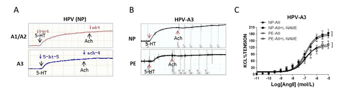 Figure 1: Endothelium-dependent vasodilatation in human placenta. (A), and (B), Acetylcholine (Ach) exhibited no vasodilatation following 5-HT-produced vasoconstriction in placental vessels from normal pregnancy (NP) and preeclampsia (PE) (N=52, n=124 for NP; N=37, n=93 for PE). (C), Pre-treated with L-NAME did not increase angiotensin II (AII)-induced vasoconstriction in NP and PE placental vessels (N=14, n=16 for NP; N=13, n=14 for PE; P>0.05). HPV-A1/A2, first-, second-order branch of blood vessels in placenta; HPV-A3, the branch of the main stem villous arteries (micro-vessels with diameter around 150um); 5-HT, serotonin; L-NAME, NG-Nitro-L-arginine Methyl Ester (a nitric oxide-synthase inhibitor). Error bars denote s.e.m. *, P<0.05; **, P<0.01. N, number of participants; n, number of vessel rings.