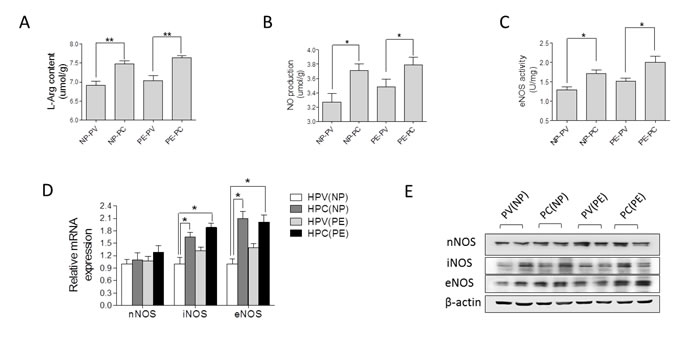 Figure 2: Nitric oxide (NO) system in human placenta. (A)-(E), L-Arg content, NO production, eNOS enzymatic activity, mRNA and protein levels of nNOS, iNOS, and eNOS in human placental vessels (HPV) and tissue (HPC) from the NP and PE pregnancies (N=15/group). NP, normal pregnancy; PE, preeclampsia; L-Arg, L-Argnine; PV, placental vessels; PC, placental tissue; eNOS, endothelial nitric oxide synthase; nNOS, neuronal nitric oxide synthase; iNOS, inducible nitric oxide synthase. Error bars denote s.e.m. *, P<0.05; **, P<0.01. N, number of participants.