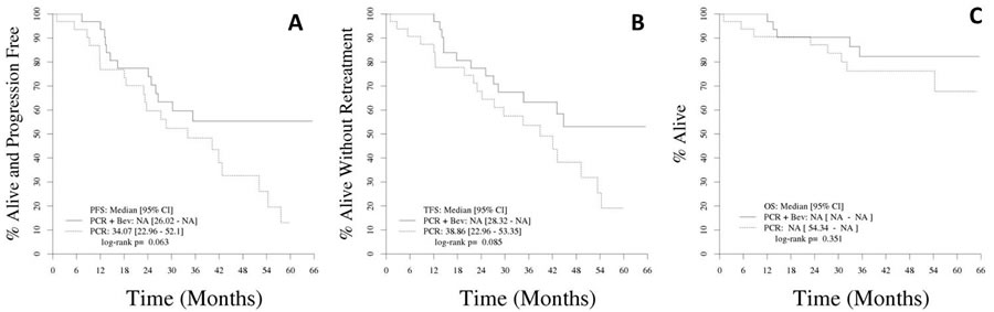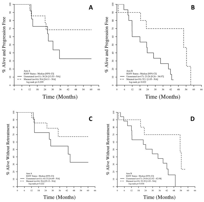 Patients treated with PCR in combination with anti-VEGF therapy had a trend toward higher complete remission rate (54.5%) than patients receiving PCR alone (31.3%). This difference met the protocol specified criteria to select PCR-B as the arm recommended for further evaluation. A higher (though not significant) MRD eradication rate was observed with the addition of bevacizumab, translating into longer PFS and TFS. In addition, when bevacizumab was added to CIT, the difference in median PFS and TFS by IGHV mutational status observed with CIT only was not observed; CIT can achieve long-term disease-free survival in patients with mutated IGHV, while only newer biological agents have so far achieved similar results in patient with unmutated IGHV.[27-30]