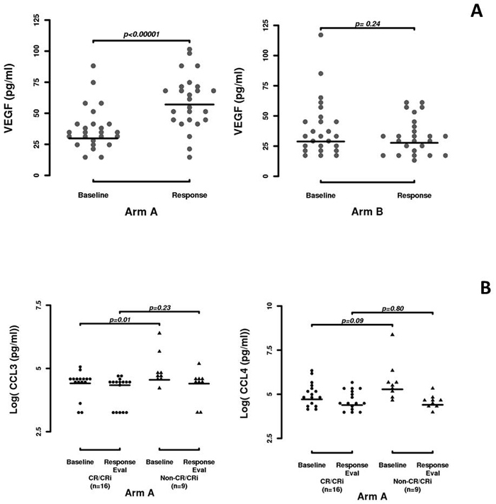 Figure 3: Plasma cytokine kinetics. A. VEGF kinetics in arm A and arm B. B. CCL-3 and CCL-4 kinetics in the PCR-B arm, comparing responders to non-responders.
