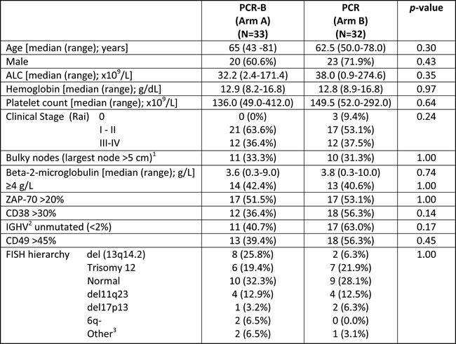 The study opened in January 2009 and completed accrual of 68 patients in January 2013. Thirty-five patients were treated with PCR-B and 33 patients were treated with PCR. Of the 68 patients accrued, 3 were not evaluable (PCR-B: 2, PCR: 1) due to incorrect diagnosis, treatment on the wrong study arm, and withdrawal prior to receiving treatment, and were excluded from all analyses. Baseline characteristics of the 65 patients evaluable for the primary endpoint (PCR-B: 33, PCR: 32) did not differ significantly between the 2 arms (Table 1).