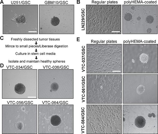 Figure 1: GSCs cultured in plates with or without polyHEMA coating. (A) Spheres of U251/GSC and GBM10/GSC. GSCs were maintained in stem cell media as spheres. Pictures were taken using a Zeiss inverted microscope with a 10X lens. (B) LN229/GSCs. Cells were grown as monolayer (left panel) in stem cell media or as spheres (right panel) in poly-HEMA-coated plates. (C) Schematic diagram illustrating the steps of GSC isolation from freshly dissected tumor tissues. (D) Spheres of GSCs derived from patient tissues. (E) Patient-derived GSCs cultured in plates with or without polyHEMA coating. These GSCs were similar to LNC229/GSCs and highlighted in bold. Scale bar is 50 μm.