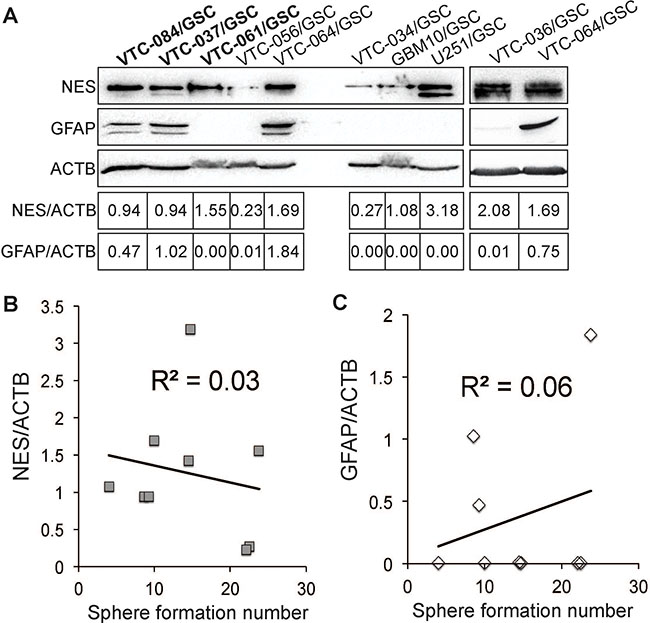 Figure 4: Expression of nestin and GFAP in GSCs. (A) The protein levels of nestin (NES) and GFAP. β-actin (ACTB) was used as the loading control. Band intensities were quantified using Image J software. The ratios of NES/ACTB are shown. Correlations between sphere formation numbers and the protein levels of nestin (B) or GFAP (A–C) were determined using the linear regression model. Coefficients of determination (R2) are shown.