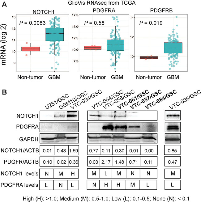 Figure 5: Expression of NOTCH1 and PDGFR in GBMs and GSCs. (A) mRNA levels of NOTCH1, PDGFRA, and PDGFRB in GBMs. Gene expression data (RNAseq) were retrieved from the TCGA database and analyzed using the GlioVis program. The mRNA levels were compared between the non-tumor control and GBM samples. (B) Protein levels of NOTCH1 and PDGFR in GSCs determined by immunoblotting. Band intensities were measured using Image J software. The legend for categorizing protein levels is shown.