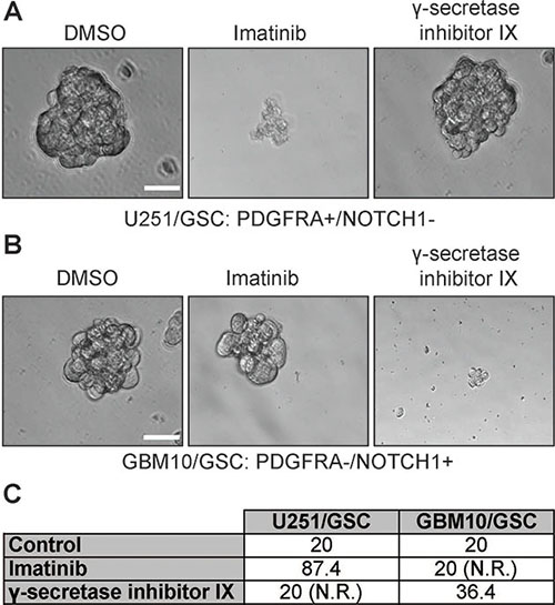 Figure 6: The effect of imatinib and γ-secretase inhibitor IX on U251/GSCs and GBM10/GSCs. U251/GSCs and GBM10/GSCs were plated at different cell densities and treated with vehicle DMSO, imatinib (10 μM), or γ-secretase inhibitor IX (20 μM). The cells were imaged (A and B) using a 40X lens of an inverted microscope. The sphere formation numbers were calculated as described in Methods section (C). Scale bar is 10 μm.
