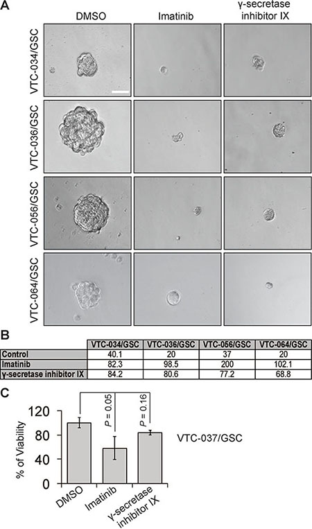 Figure 7: The effect of imatinib and γ-secretase inhibitor IX on patient-derived GSCs. GSCs were plated at different cell densities and treated with vehicle DMSO, imatinib (10 μM), or γ-secretase inhibitor IX (20 μM). Cells were imaged using a 40 X lens of an inverted microscope (A). The sphere formation numbers were determined based on numbers of cells plated and the percentages of wells with no spheres (B). The responses of VTC-037/GSC to these drugs were determined using the MTS viability assay (C). Scale bar is 10 μm. Error bars represent standard deviations from three independent experiments.