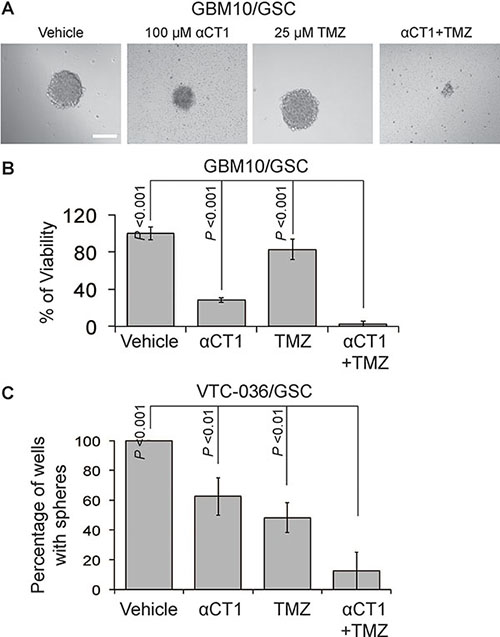 Figure 8: The effect of αCT1 and TMZ in GBM10/GSCs and VTC-036/GSCs. (A) GBM10/GSCs treated with αCT1 and/or TMZ were imaged using a 40 X lens of an inverted microscope. Scale bar is 10 μm. (B) The viability of GBM10/GSCs determined by the MTS viability assay. (C) The sphere formation of VTC-036/GSCs. Error bars represent standard deviations from three independent experiments.