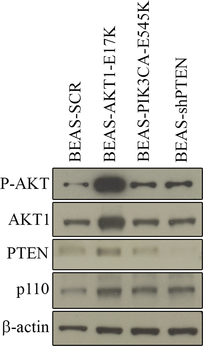 Figure 1: Expression of AKT1-E17K, PIK3CA-E545K, PTEN in BEAS-2B cells and derivatives. Immunoblot analysis of BEAS-2B cells and derivatives for the expression of the phosphorylation of AKT and for the expression of AKT1, PTEN, p110. ß-actin was used as loaded control.