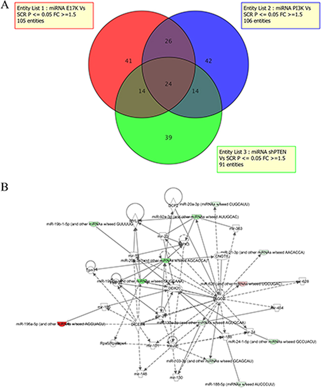 Figure 2: MiRNA profiling of BEAS-2B cells and derivatives. A. Venn diagram of DEMs in BEAS-AKT1-E17K, BEAS-PIK3CA-E545K and BEAS-shPTEN. B. Network analysis was performed to provide a graphical representation of miRNAs and genes having known biological relationships. Green icons indicate down-regulated miRNAs and genes and red icons indicates up-regulated miRNAs.