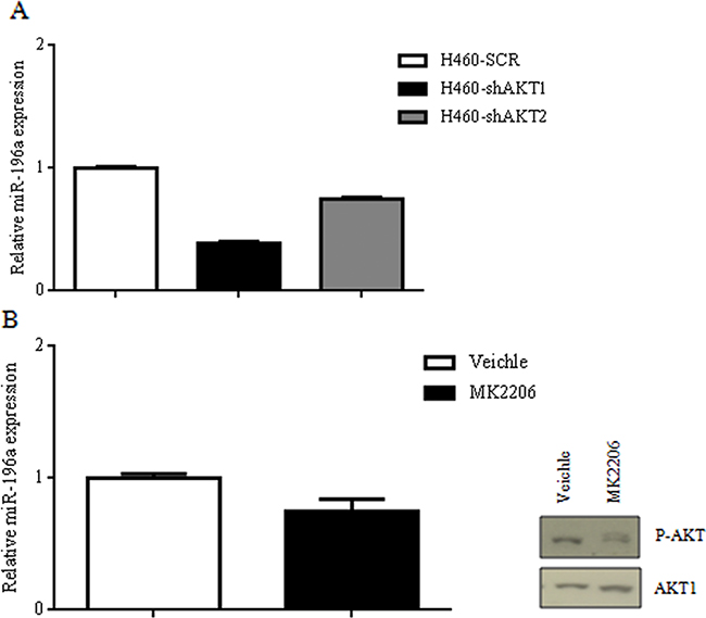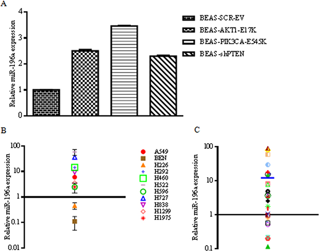 The overexpression of miR-196a in NSCLC is a common event, and it is not extremely novel per se. On the contrary, the novelty of this study resides in positioning miR-196a downstream the PI3K/AKT pathway. To further investigate the relationship between the PI3K/AKT pathway and miR-196a expression, first we correlated the levels of miR-196a with the activation status of the PI3K/AKT pathway in 7 NSCLC cell lines, of which the activation status of the PI3K/AKT pathway was known [12]. In this case, we found that 2 out of 3 pAKT negative cell lines presented low levels of miR-196a whereas 4/4 pAKT positive cell lines presented high levels of miR-196a. See Table 2.