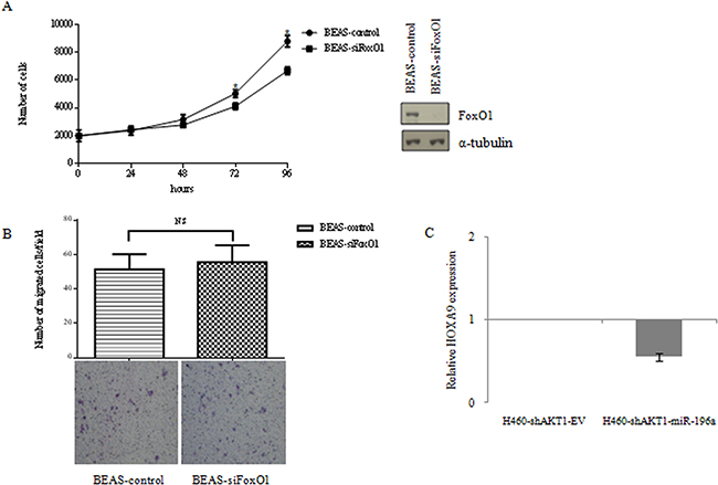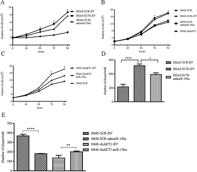 For further studies we chose miR-196a on the basis of the following considerations. MiR-196a was the DEM with the highest average fold change, being >2 in all three BEAS-AKT1-E17K, BEAS-PIK3CA-E545K and BEAS-shPTEN cell lines. MiR-196a also turned out to be the only DEM present in relevant networks (Figure 2B, Network 2) by IPA analysis where it was the most highly up-regulated among the DEMs of Network 2 (Supplementary Figure S2).
