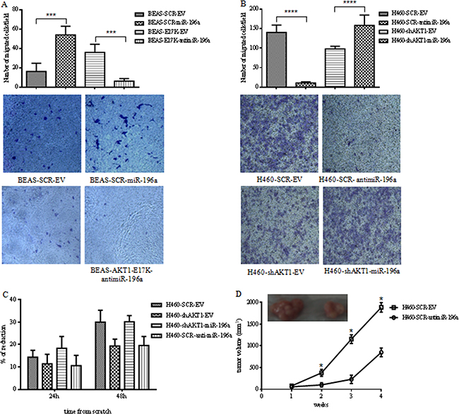 To determine the role of miRNAs in lung cancer driven by aberrant PI3K/AKT signaling, we have examined changes in miRNA levels that are induced by alterations of this pathway through different mutations that are observed in human NSCLC [11], including a gain-of-function mutant of PIK3CA (E545K), a gain-of-function mutant of AKT1 (E17K) and the loss of PTEN expression [12, 13, 45, 46]. Here we report that miR-196a is modulated by mutant PI3K, mutant AKT1 and by loss of PTEN, and represent a pivotal mediator of proliferation, migration/invasion and tumorigenicity elicited by aberrant activation of PI3K/AKT pathway.