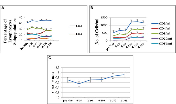 The CD4/CD8 ratio consistently increased from day 28 of nilotinib administration (0.55 ± 0.18); 0.7 ± 0.11, 0.85 ± 0.17, and 0.91 ± 0.21 at days 180, 270, and 335, respectively (Figure 1C).