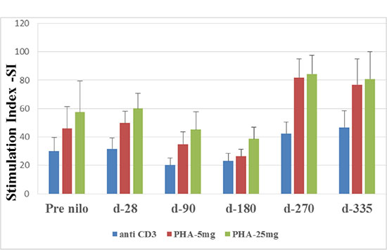 Similar results were observed in response to PHA at 5 mg and 25 mg. Pick low stimulation index was observed at day 180 (26.3 ± 5.2; and 38.6 ± 8.3; respectively), increased at day 270 (81 ± 13.3; p = 0.02 and 84.5 ± 13.1; p = 0.03, respectively) and remained high at day 335 (76.8 ± 18.3; p = 0.05 and 80.7 ± 19.4; p = 0.09) (Figure 2).