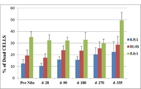 Figure 3: Cytotoxic activity of NK effector cells against K562 cell line as target cells. The cytotoxic activity of NK cells is presented as the percent of dead target cells at d-28, 90, 270 and 335 post nilotinib administration, after co-culture at different E:T ratios. NK cells were obtained from peripheral blood samples of post SCT patients treated with nilotinib. NK–natural killers, E-effector, T- target.