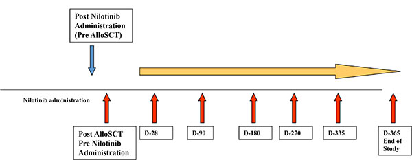 Figure 4: Study design of immunological assessment following SCT and nilotinib administration. Patients’ samples were collected at different time post nilotinib administration (red arrows). Samples obtained from patients post SCT, before nilotinib administration served as a specific control.