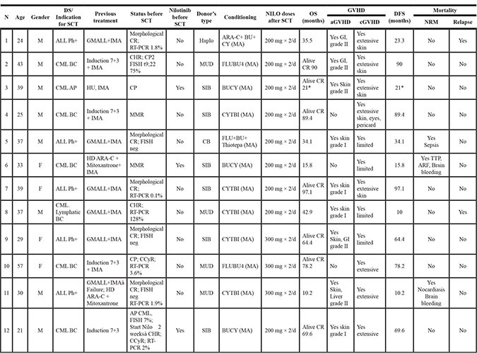 Relapse rates after allo-SCT are as high as 30–40% and 30–60% for both advanced phase CML and Ph+ ALL, respectively [4, 5]. Therapeutic strategies to prevent or treat relapse after allo-SCT include withdrawal of immunosuppression and donor lymphocyte infusions (DLI) [6, 7]. Given their value in treating relapsed CML or Ph+ ALL [8–15], TKIs were also studied as part of a preemptive or prophylactic approach post allo-SCT. Several groups have evaluated imatinib for the prevention of relapse in high-risk CML and Ph+ALL patients with encouraging results [16–20]. Second generation TKIs, including nilotinib, may be more efficient in preventing and treating relapse of advanced CML and Ph+ ALL [7, 21]. However, data on their use in the post allo-SCT setting are limited [7, 22, 23].