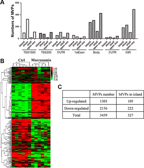 Figure 1: DNA methylation in genomic level altered in cord blood from macrosomia. (A) Distribution of a total of 3459 methylation variable positions (MVPs) after the initial statistical significant filter (adjusted P-value < 0.05 and methylation differences of ≥ 5%) according to epigenetic/genomic feature. Y-axis denotes specific numbers of MVPs involved in each epigenetic/genomic feature; X-axis denotes genomic features (annotated as TSS1500, TSS200, 1stExon, 5´UTR, 3′UTR, gene body or IGR, andepigenetic feature-distances from a CG enriched region (CGI) (island, shore, shelf, open sea). (Abbreviations: TSS1500, within 1.5 kB of transcriptional start site; TSS200, within 200 bp of transcriptional start site; IGR, intergenic region). (B) Heat map including the top statistically significantly MVPs in island (n = 327, adjusted P-value < 0.05 and methylation differences of ≥ 7%). (C) The number of up-regulated and down-regulated MVPs with different filters.
