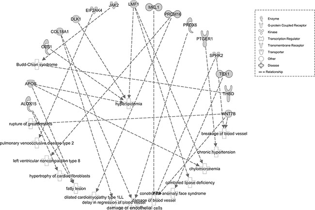 Figure 3: Downstream effect analysis of specific genes with differentially methylated CpGs associated with CVD. For this cardiovascular function network, genes or gene products are represented as nodes, and the biological relationship between two nodes is represented as an edge. All edges are supported by at least one publication in the Ingenuity Knowledge database. The legend of the interaction network and the relationships between molecules are summarized on the right of the figure.
