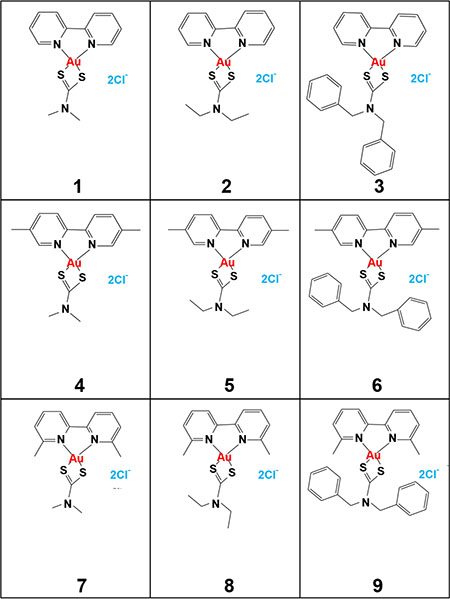 Figure 1: Chemical structure of the nine new synthesized gold(III) complexes (compound 1–9).