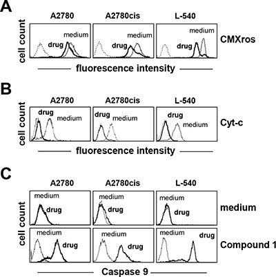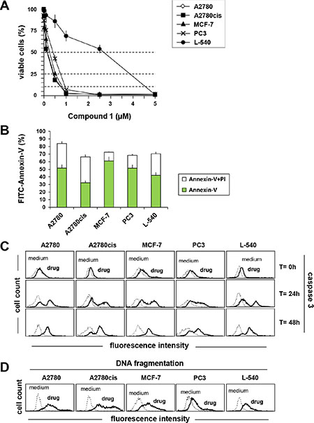 PC3 (2.5 × 104), MCF-7 (5.0 × 104), A2780 and A2780cis (5.0 × 104), and L-540 cells (2.0 × 105/mL) were incubated in six-well plates with compound 1 (IC75) (Figure 1) for 72 h. Annexin-V binding (Becton-Dickinson [BD] Pharmingen, San Jose, CA) together with propidium iodide (PI) staining was detected in tumor cells by flow cytometry, as described [37, 38]. Caspase 3 and 9 activation was evaluated using the fluorochrome inhibitors of caspases (FLICA) Caspa-TagTM caspase-3/7 (FAM-DEVD-FMK) and caspase 9 (FAM-LETD) (Chemicon International, Milan, Italy). Briefly, cells were treated with compound 1 (IC75), then harvested, washed and resuspended in warmed complete medium supplemented with FLICA for 1 h and then immediately analyzed by flow cytometry. DNA fragmentation was assessed using the Apo-Direct kit (Becton-Dickinson Pharmigen, CA, USA) according to manufacturer’s instructions. For mitochondrial ROS evaluation, cells treated with compound 1 were incubated with 5 μM of MitoSox reagent working solution (Molecular Probes, Invitrogen) for 30 minutes at 37°C. Red fluorescence was immediately analyzed by flow cytometry. Viable cells were identified according to their forward and right-angle scattering, electronically gated and analyzed on a FACScan flow cytometer (BD), using CellQuest software (BD). In another series of experiments, cells were exposed to compound 1 (IC75) in the presence or absence of the antioxidant and ROS scavenger N-acetyl-cysteine (NAC; 5 mM) (Sigma). After 72 h, ROS formation and viable cells number were evaluated by flow cytometry and trypan blue dye exclusion assay, respectively. To evaluate the dissipation of the mitochondrial membrane potential, 200 nM MitoTracker® Red CMXRos (Molecular Probes, Invitrogen, Milan, Italy) was added to the cell culture for 30 min, then cells were washed twice and analyzed by flow cytometry. Cytochrome-c (Cyt-c) release was assessed using the mouse anti-Cytochrome-c antibody (BD), followed by PE-conjugated goat anti-mouse IgG (BD), as explained elsewhere [49].