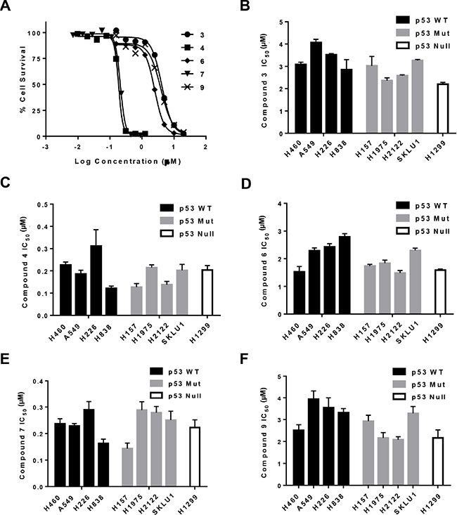 PC3 and MCF-7 cells (2.5 × 103), A2780, A2780cis (4.0 × 103), A2780CP-16 and lung cancer cells (H460, A549, H226, H838, H157, H1975, H2122, SKLU1 and H1299) were seeded in 96-well flat-bottomed microplates (100 μL) and incubated for 24 h (to allow cell adhesion) before drug testing. The medium was then removed and replaced with fresh medium containing the gold(III) complexes (compound 1–9) to be tested at increasing concentrations (from 0.01 to 100 μM) at 37°C for 72 h. Each treatment was performed in triplicate. Cell proliferation was assayed using the MTT assay. Alternatively, L-540 cells (2.0 × 105/mL) were seeded in 96-well plates and treated as previously described [37]. After treatment, cell proliferation was evaluated by the MTS assay (Promega). IC50 (i.e., the half maximal inhibitory concentration representing the concentration of a substance required for 50% in vitro inhibition) IC75 and IC90 values (Supplementary Table S1) were calculated using the CalcuSyn software (Biosoft, Ferguson, MO, USA) [47]. Dependence of activity on p53 was assessed in A2780 cells following p53 knockdown by CRISPR [48].