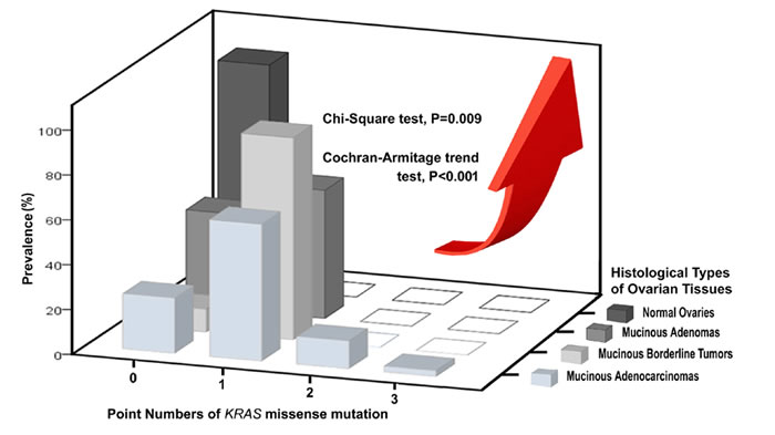 There are significant differences among the 4 types of Kras mutation with different missense point numbers (n = 0-3). (Chi-Square test, p = 0.009) (Figure 2) Their prevalence stratified by Kras missense mutation numbers (n = 0-3) show a significantly increasing trend in the sequence order from the histologically normal ovaries through MA to MBT to MC (Cochran-Armitage trend test, p < 0.001). (Figure 2)