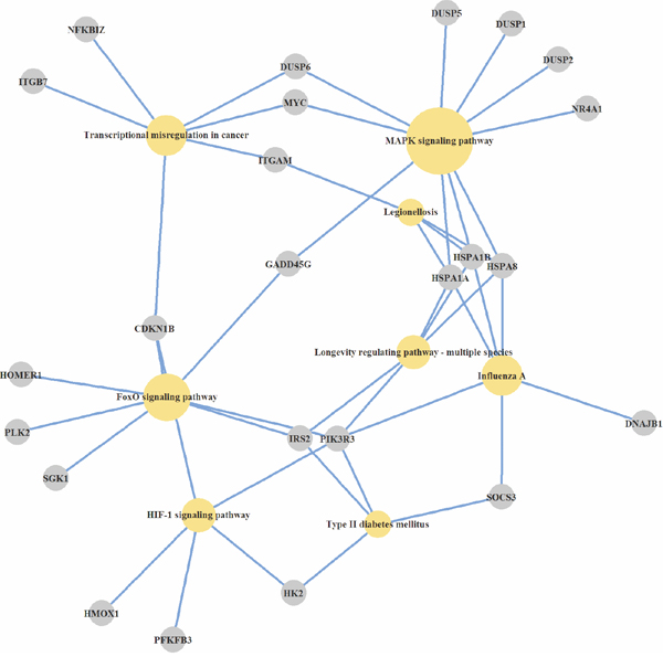 Thus, the analysis of over-represented pathways across differentially expressed genes revealed the number of cellular mechanisms that are modulated by Abisil (Figures 1-3). Among them: “MAPK signaling pathway”, “p53 signaling pathway”, “Apoptosis”, “Cell cycle”, “Transcriptional misregulation in cancer”, “HIF-1 signaling pathway”, “FOXO signaling pathway”, “TGF signaling pathway”, “TNF signaling pathway”, “Amino sugar and nucleotide sugar metabolism”, and “Protein processing in endoplasmic reticulum”. There are also a series of processes at the organismal level: “Longevity regulating pathway”, “Type II diabetes mellitus”, “Insulin resistance”, and “Infectious diseases (Influenza A, Legionellosis)”. The last one suggests the potential effect (it is difficult discuss about the direction of this effect a priori) ofAbisil on the penetration and proliferation of infectious agents or immune response.