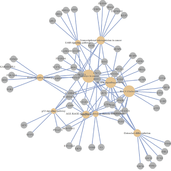 EGR3, INHBA, PDK4, JUN, CTGF, DDIT4, GDF15, EGR2, EPHA2, EGR4, CLCF1, MYC, GCLM, CXCR3, PPP1R15A, VEGFA, RFFL, OSGIN1, EGR1, GADD45B, CYR61, SNAI2, SOCS3, THBS1, FOSL1, SERPINE1, ID1, CEBPB, DDIT3, DUSP6, DSG3, EDAR, BMP2, PLK2, PLK3, ATF3, C8orf4, SPRY2, ANXA1, TNFRSF1A, PMAIP1, TNFSF15, ASNS, SOX9, NUAK2, RNF41, PIM1, CTH, SIAH2, TNFRSF10B, GATA6, SQSTM1, IER3, CHAC1, STK40, TCF7L2, GADD45A, SOCS2, RIPK2, BIRC3, RHOB, FOXO3, F3, TNFSF9, PAWR, WNT7B, ARHGEF2, ADM, H1F0, ZC3H12A, HERPUD1, HK2, NCF2, DUSP1, ANKRD1, AEN, BBC3, PLEKHG2, EDN1, CITED2, GADD45G |