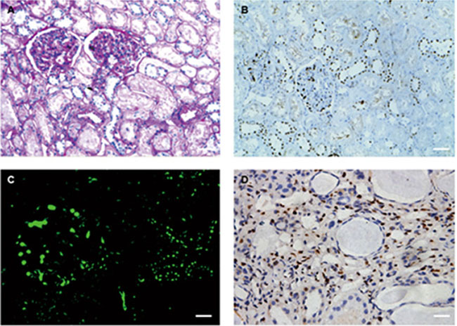 Figure 1: PAS staining, immunohistochemistry and immunofluorescence for DACH1. (A) PAS staining in normal kidney. (B) Sequential sections with A and showing positive staining for DACH1 in human normal kidney. (C) Immunofluorescence for DACH1, showing the intensity of expression of DACH1 in glomerular is higher than tubules. (D) DACH1 staining in renal tissue with fibrosis, seeing renal interstitium was positive for DACH1. Original magnification × 400, Bar, 50 μm.