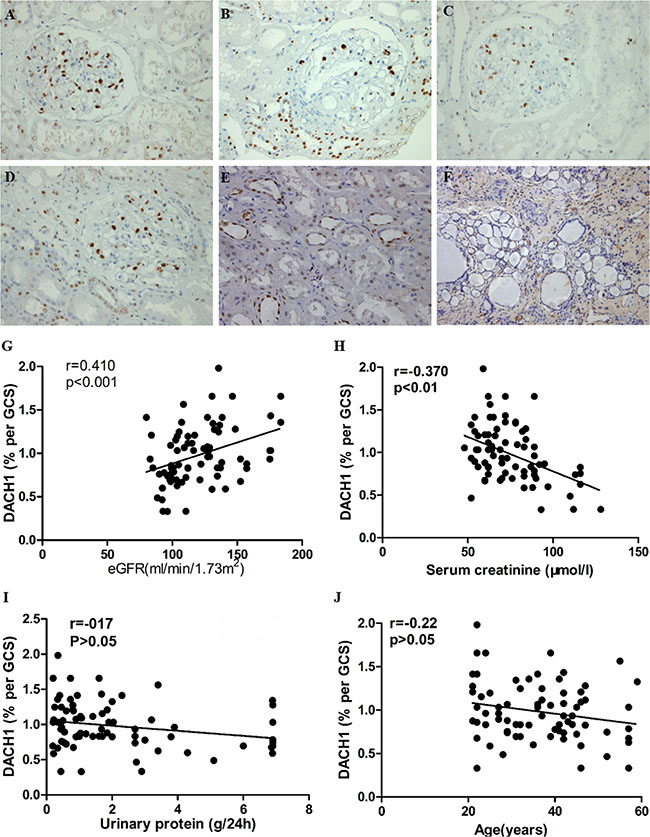 Figure 2: DACH1 expressed in normal and glomerulopathy renal tissue, and correlated with clinical parameters. (A) DACH1 staining in normal renal tissue obtained from nephrectomy specimens. (B, C, and D) DACH1 staining for minimal change disease, immunoglobulin A nephropathy, and idiopathic membranous nephropathy, respectively. (E) DACH1 expression in normal kidney tubules. (F) DACH1 staining in lesioned renal tissue. The DACH1 expression in glomerulus shows a positive correlation (G) with eGFR and a negative correlation (H) with serum creatinine. Such level reveals no relevance with 24 h urinary protein (I) and patients’ age. All photos shown display immunoperoxidase stains with hematoxylin counterstain. All tissue sections are counter-stained with periodic acid-Schiff; original magnification × 400, Bar, 50 μm.
