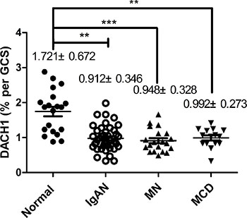 Figure 3: The magnitude of DACH1-expressing in glomerulus. Compared with normal kidneys, DACH1 expression was decreased in kidneys associated with IgAN, MN, and MCD, **P < 0.001, ***P < 0.01, **P < 0.01, respectively. IgAN vs MN, IgAN vs MCD, MN vs MCD, P > 0.05, respectively, Tukey’s Multiple comparison test. The horizontal bars represent medians.
